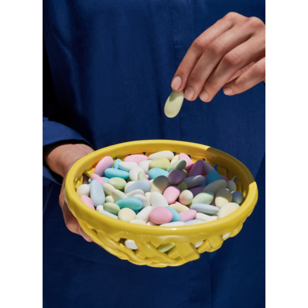 Each basket is made of delicately woven earthenware, creating a striking swirled pattern. This visual fluidity is enhanced by a fine, glossy glaze in contemporary colours.