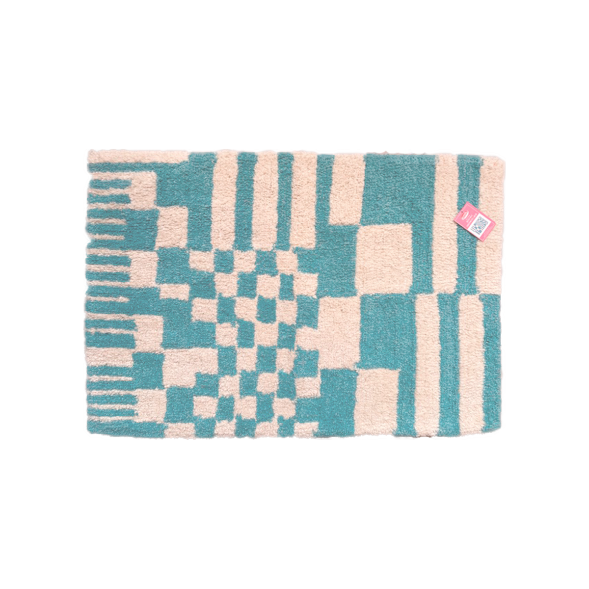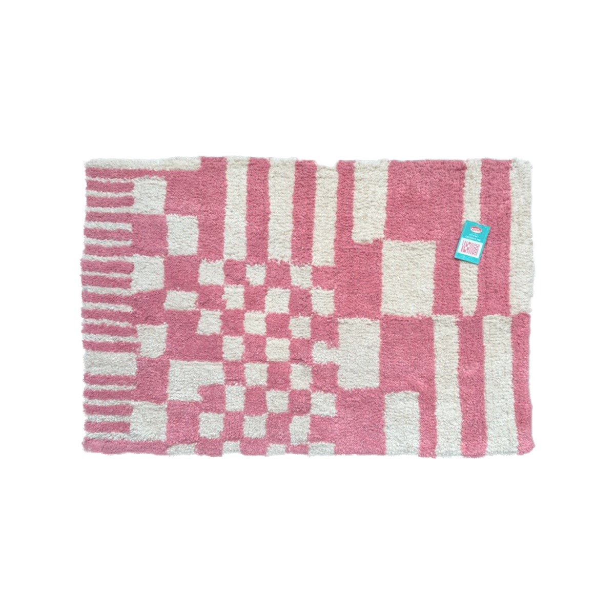 Warm bath mat made of recyled yarn with a colorful chess pattern .