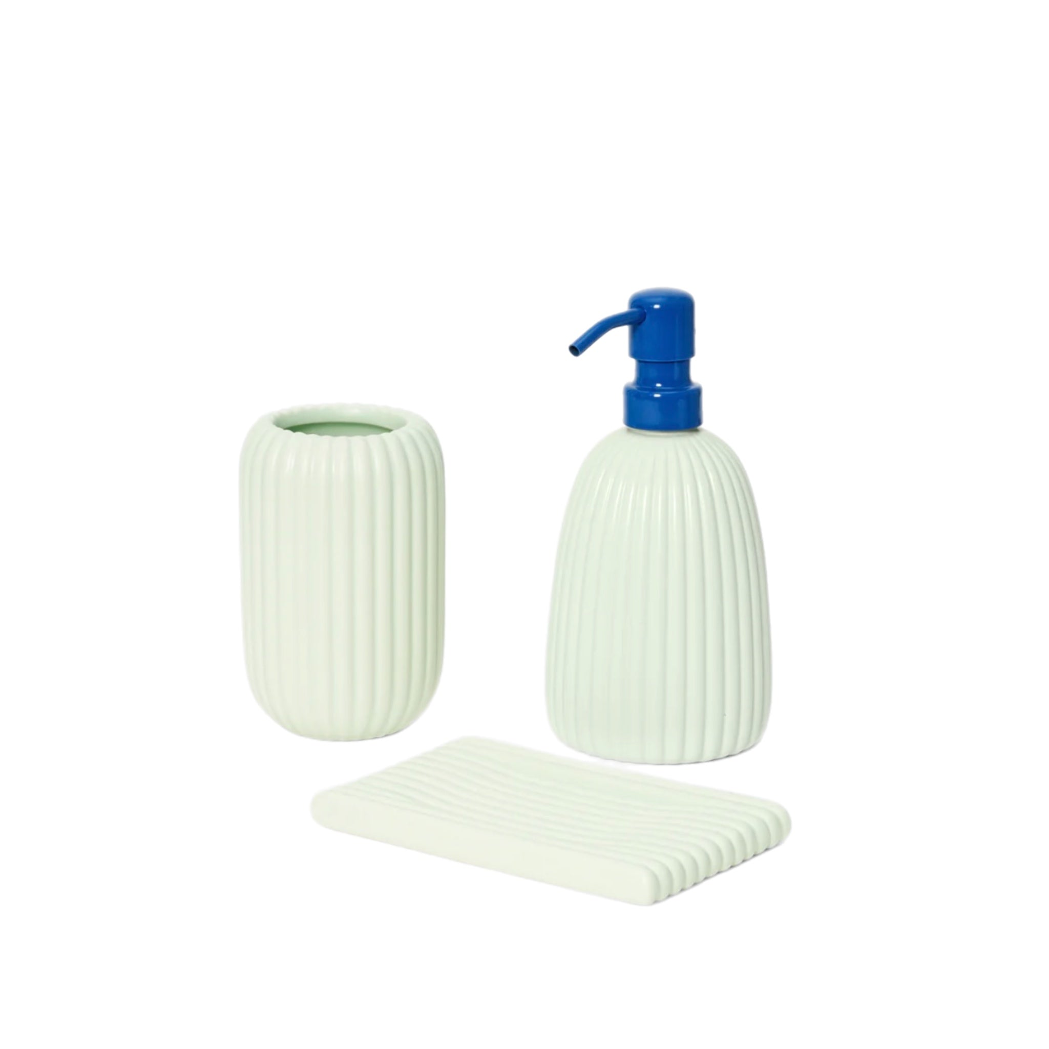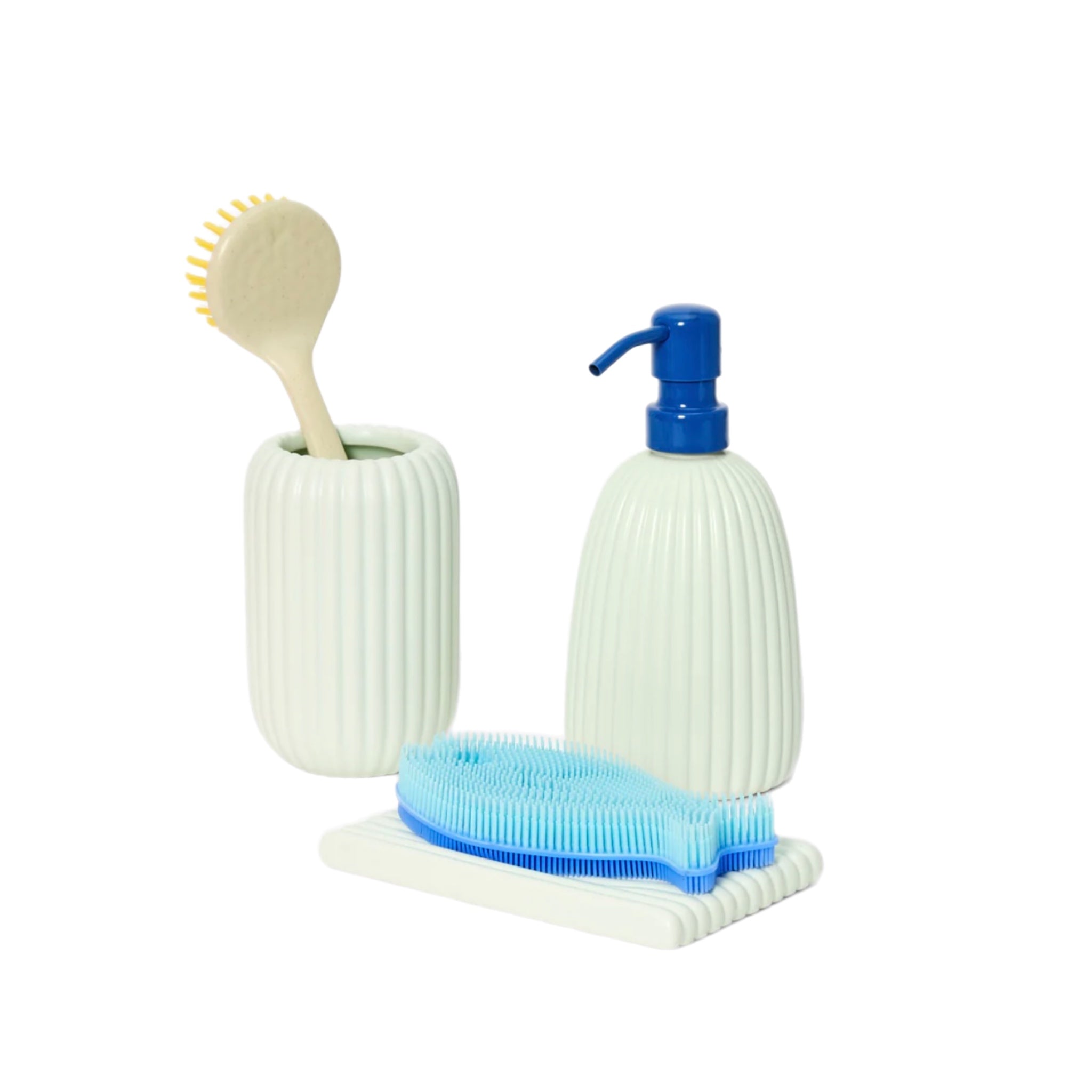 A collection of sink-friendly accessories inspired by Helen Levi’s Corduroy tile collection.