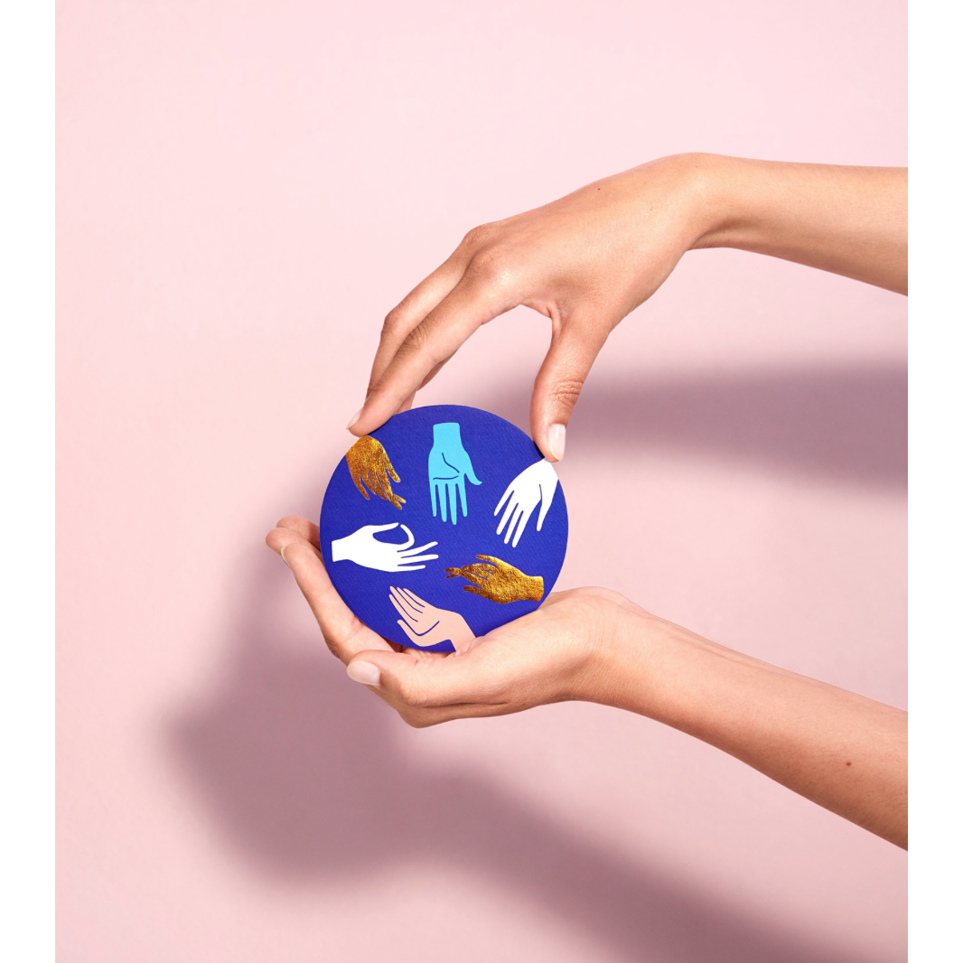 This set of 12 original coasters features our signature print of Hamsa, the ancient protective symbol of the hand. May it bring you happiness, luck, health, and good fortune.