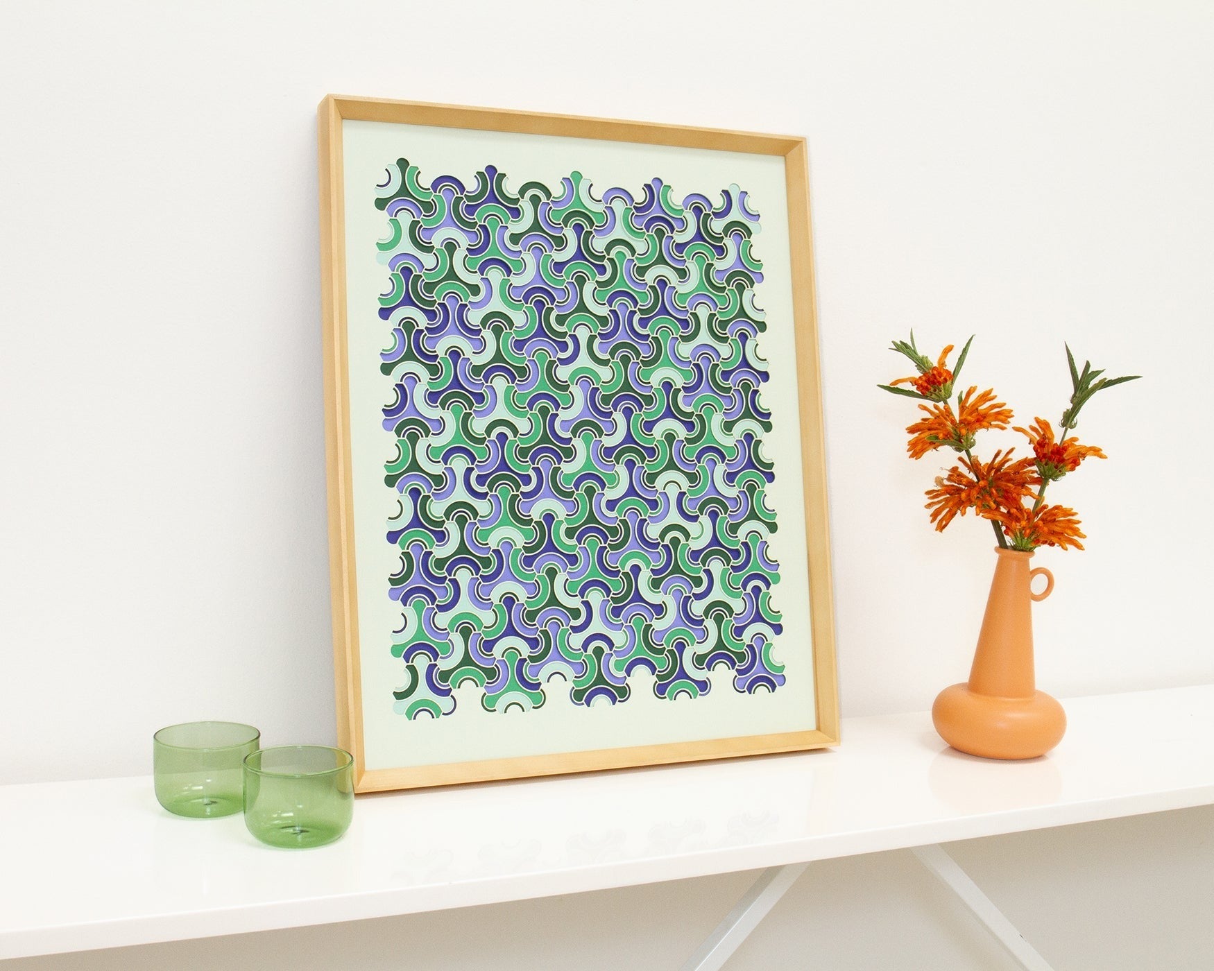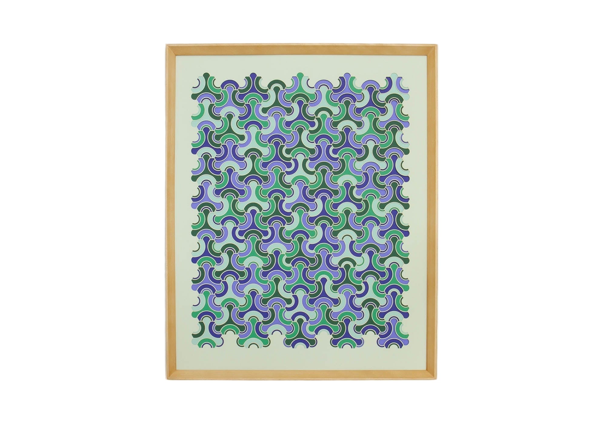 Multiple sheets of layered paper. The frame is made of poplar with a natural finish, the frame glazing is a sheet of glass. All MMD products are designed and produced in our Berkeley studio.