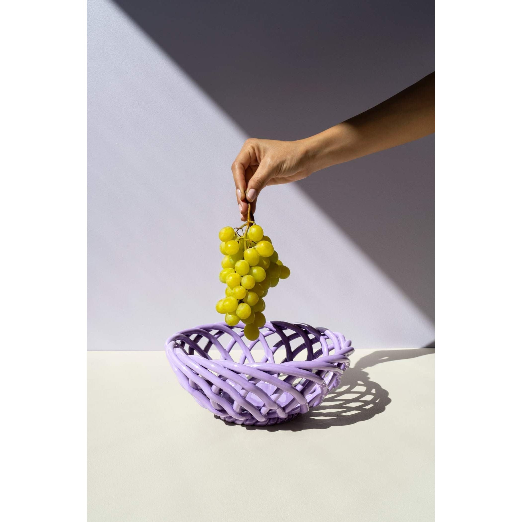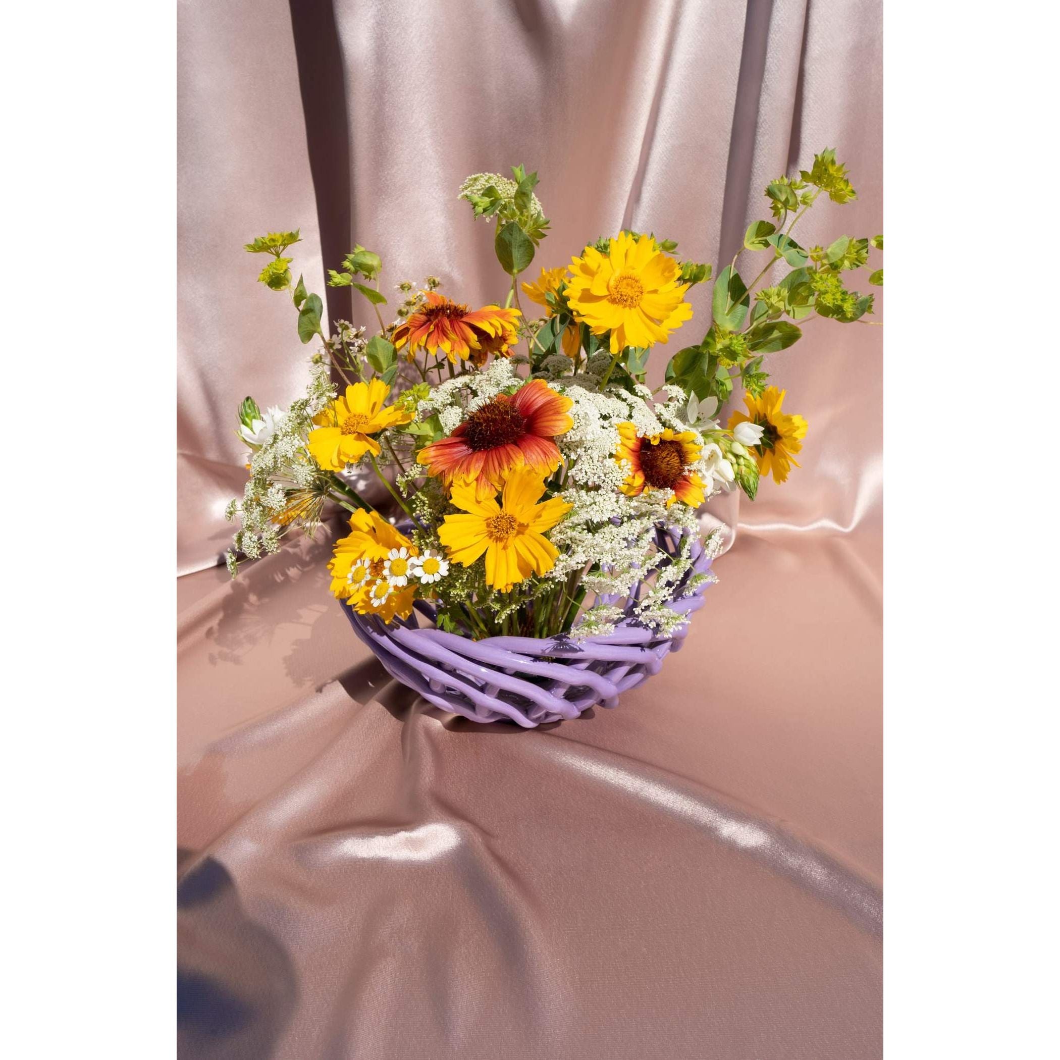 Each basket is made of delicately woven earthenware, creating a striking swirled pattern. This visual fluidity is enhanced by a fine, glossy glaze in contemporary colours.