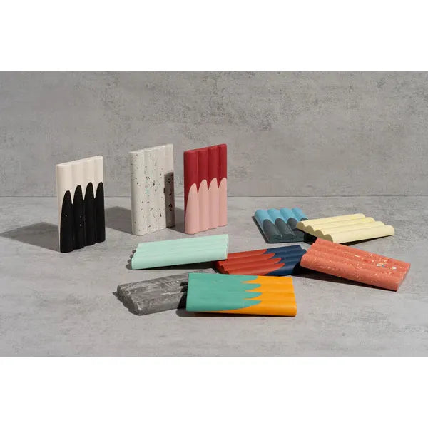 The soap dish is made from Jesmonite, a durable solvent-free, non-toxic, and eco-friendly composite. The two tone split finish is cast using gravity and all the colours are carefully chosen. All of the process is done by hand which means there will be a slight variation color and finish creating a uniqueness to each piece.