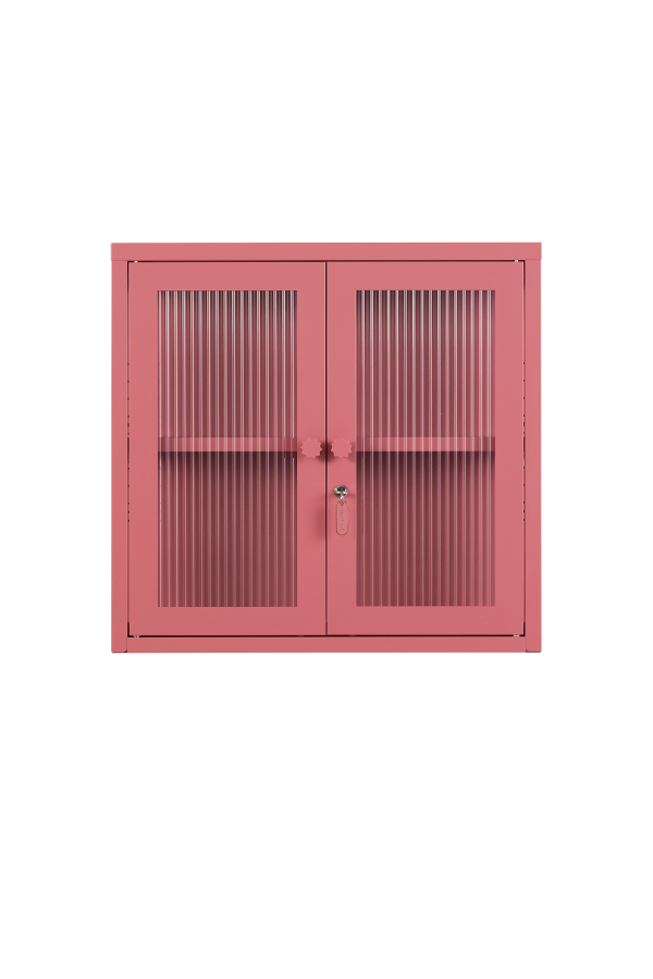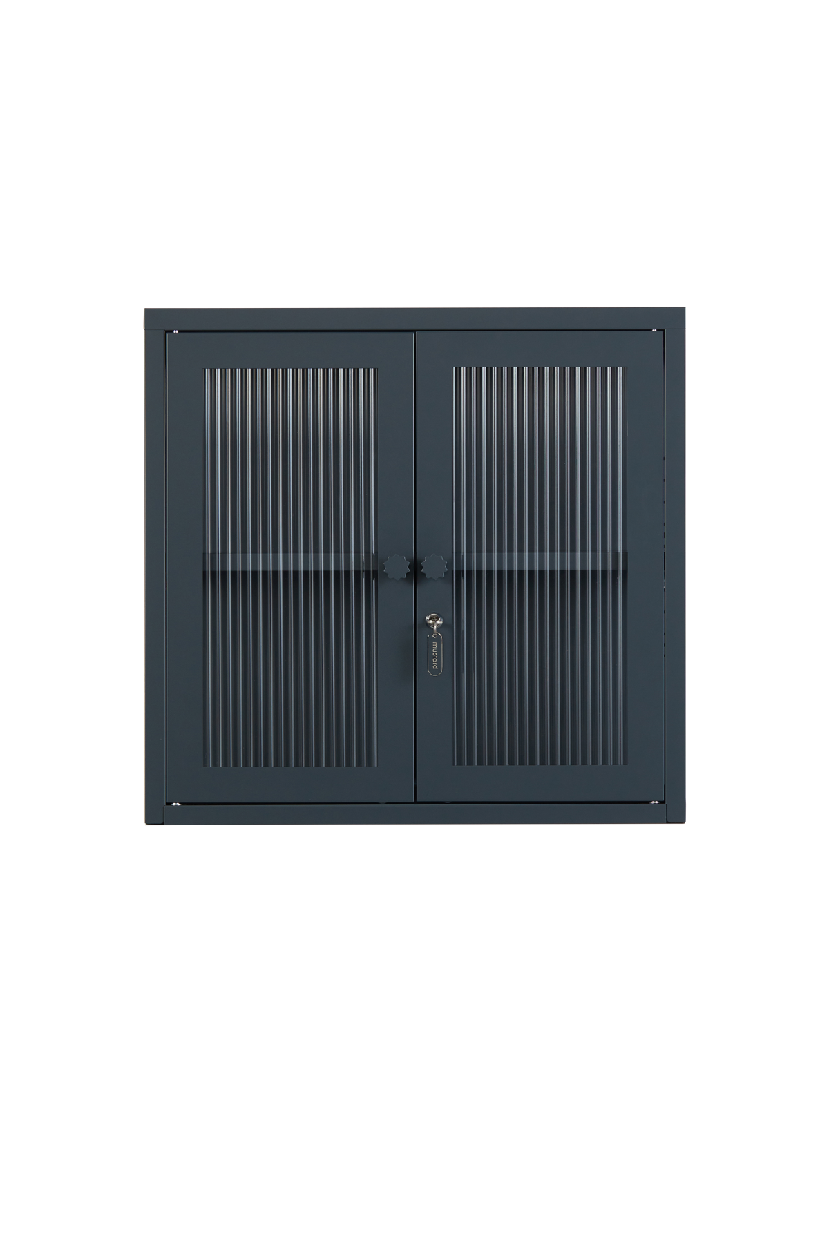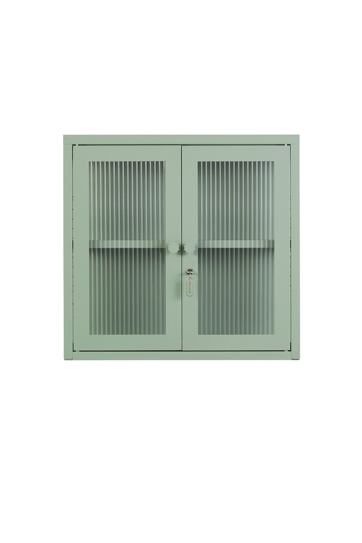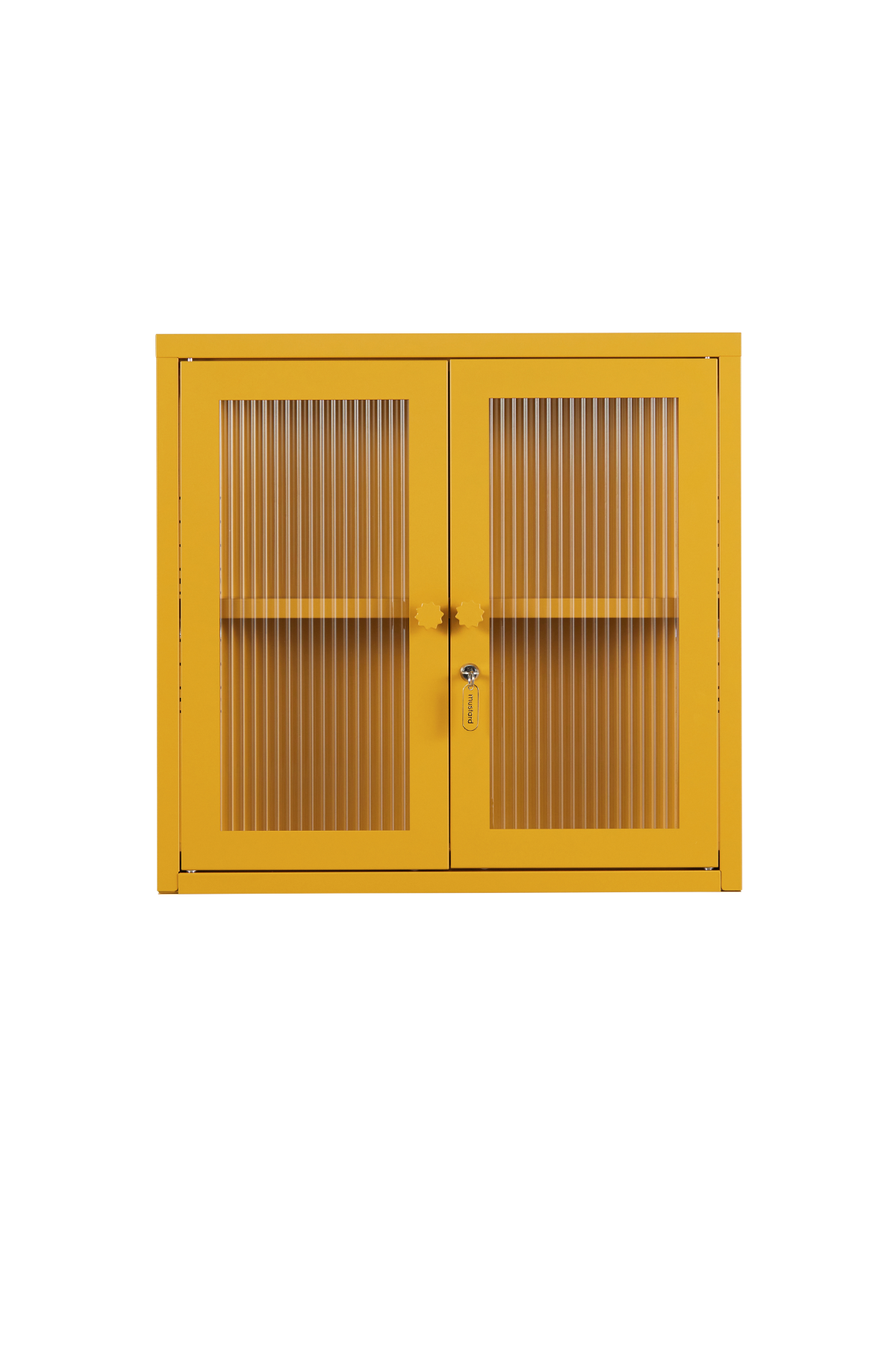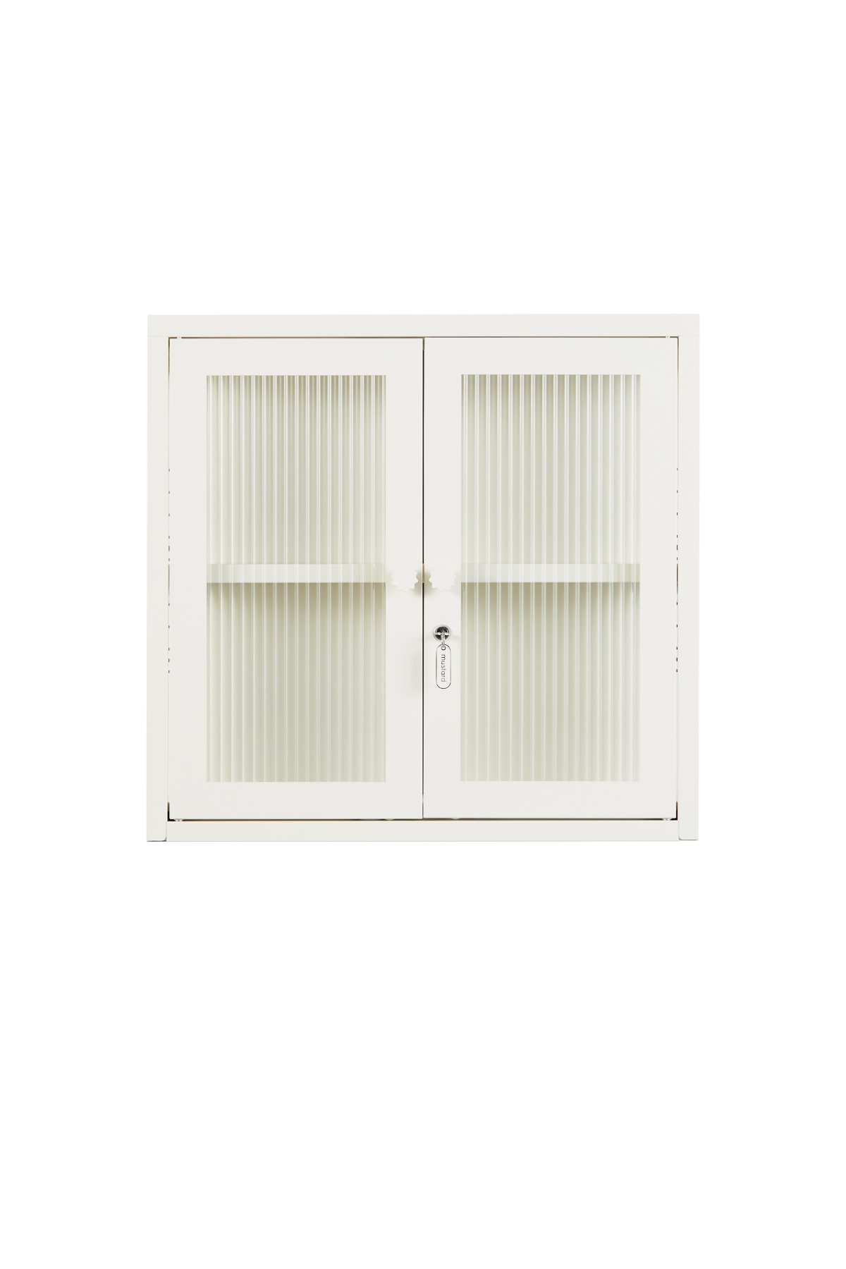 An adjustable shelf, lockable doors and fluted glass panels set in a metal frame.