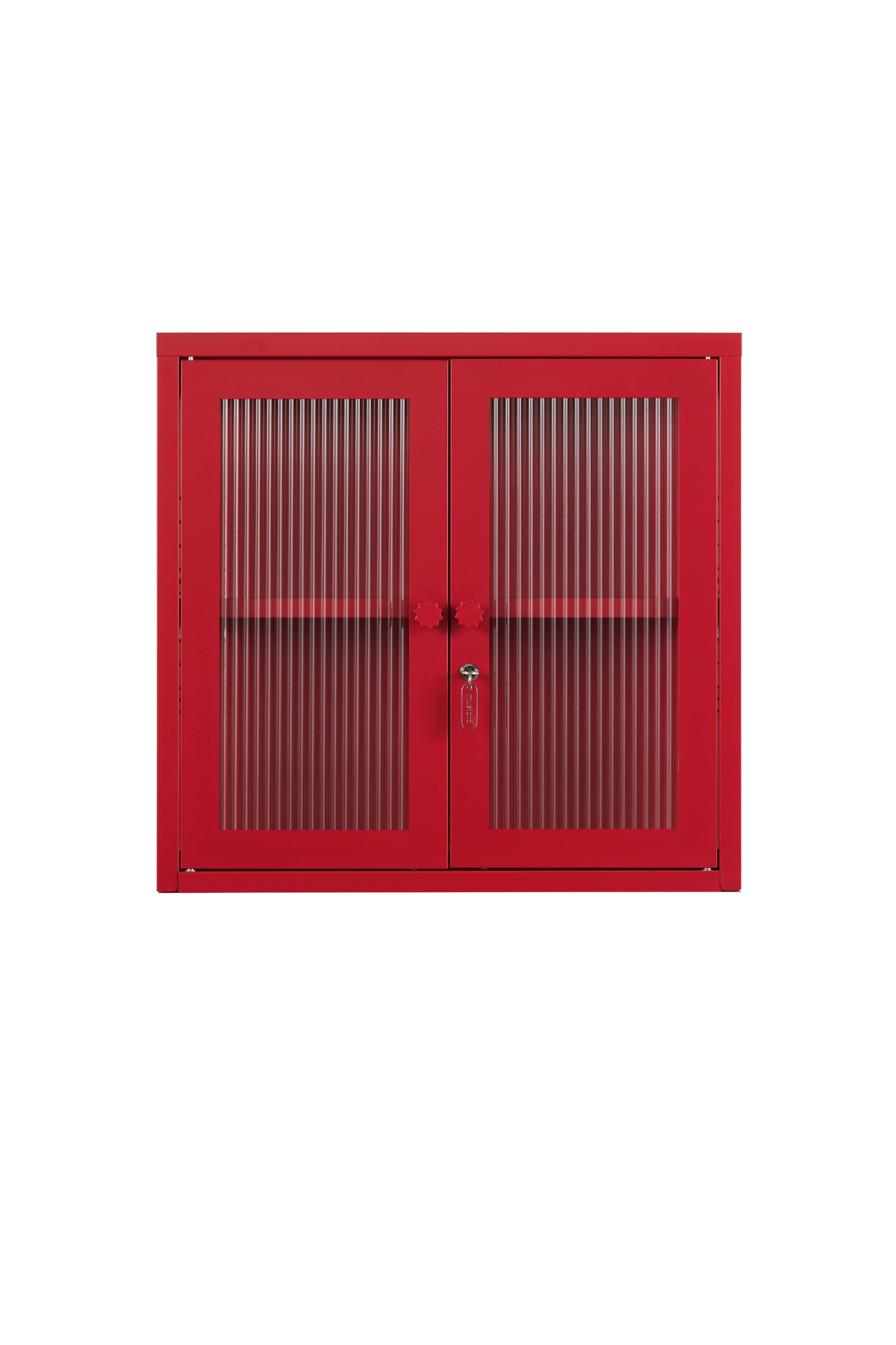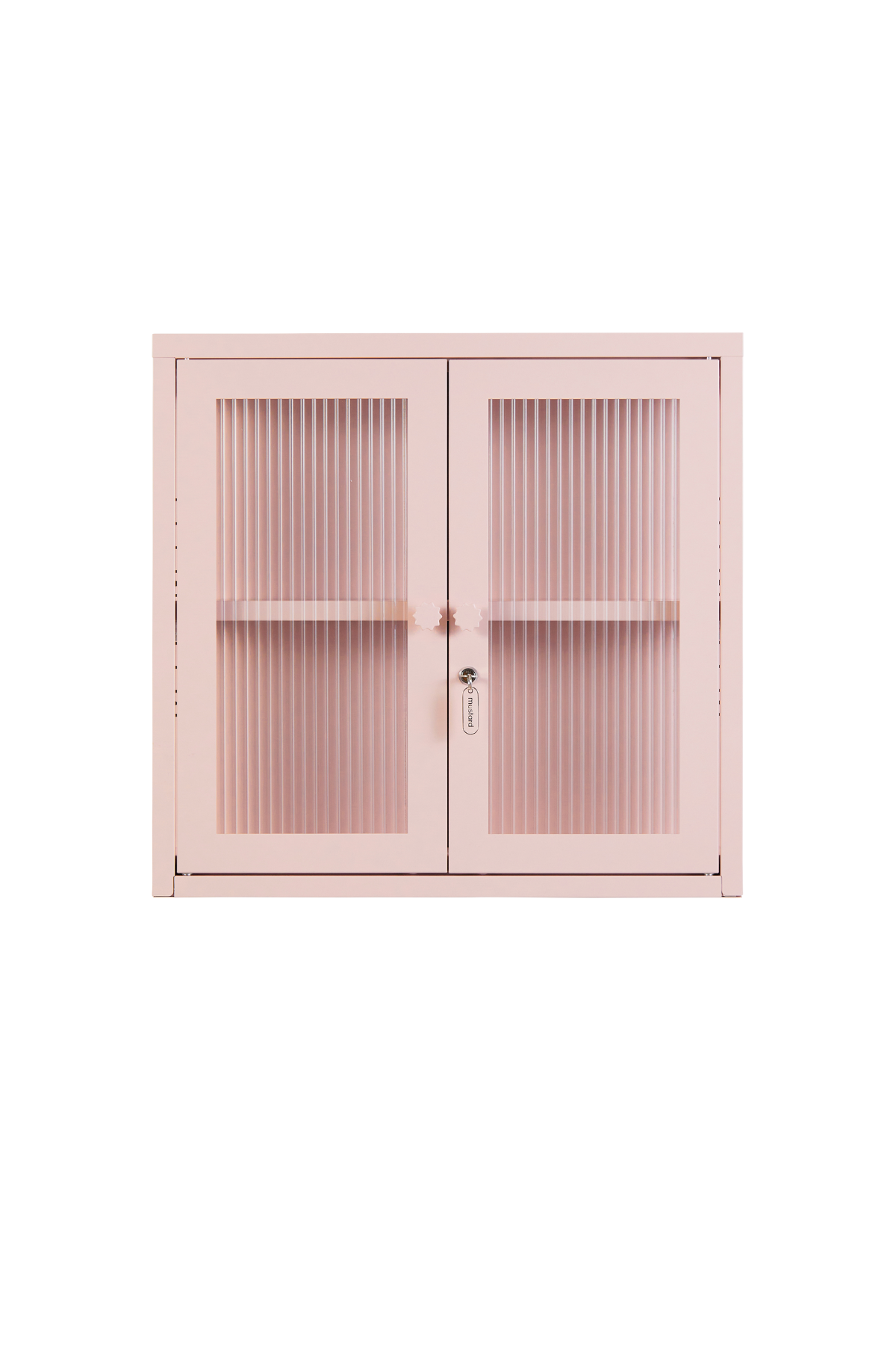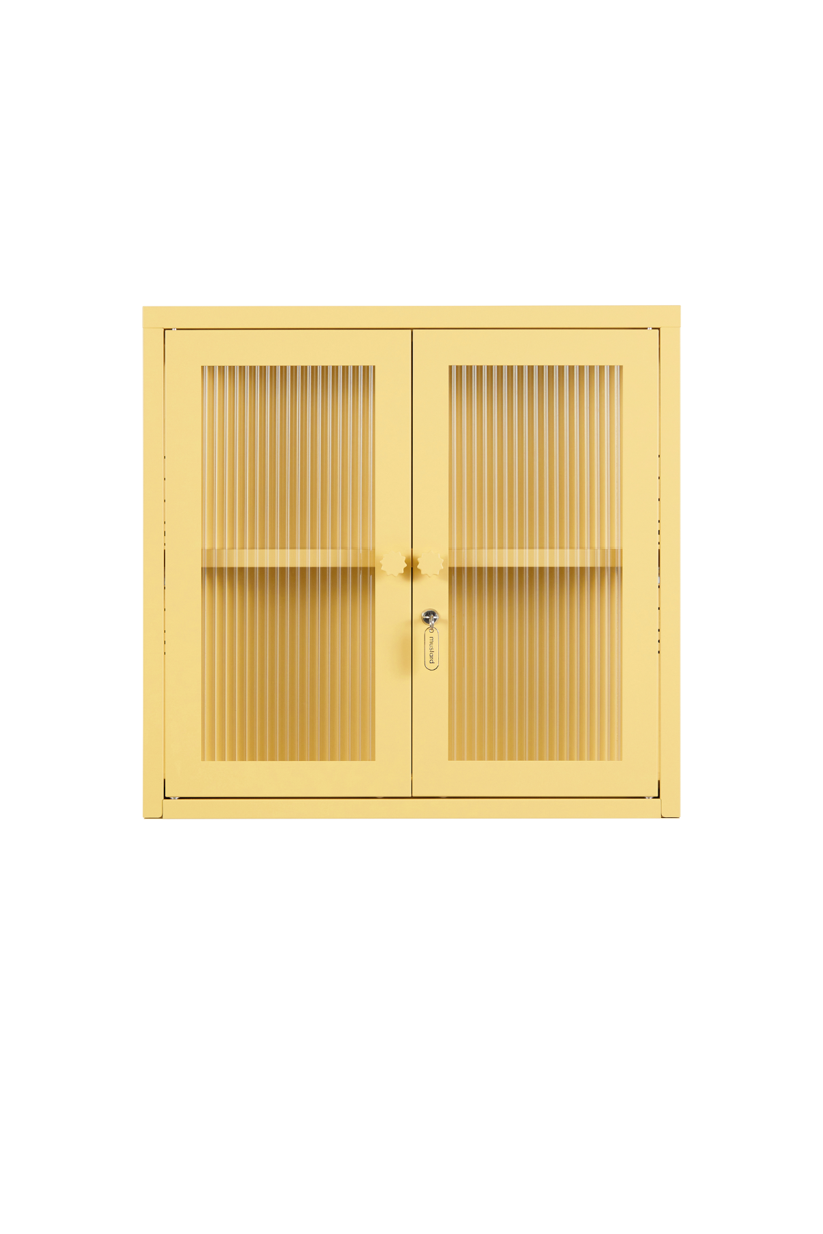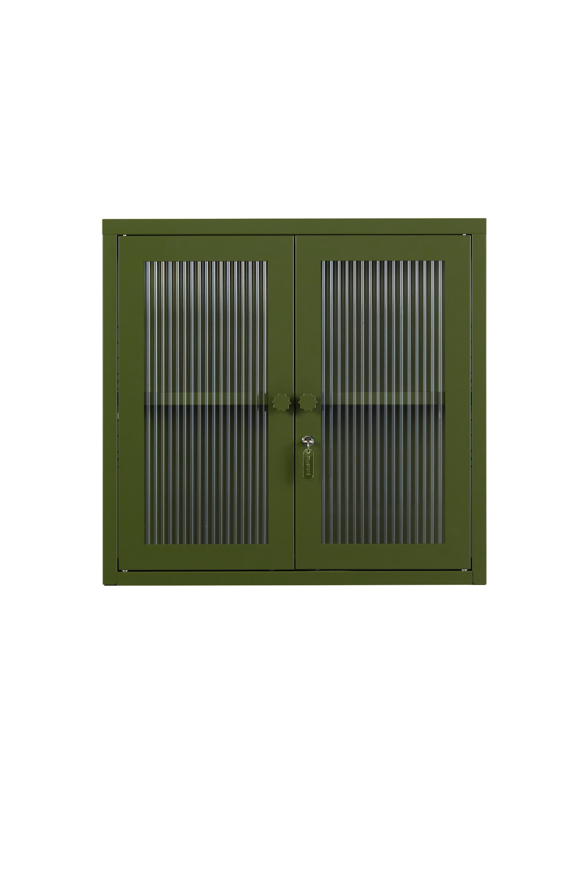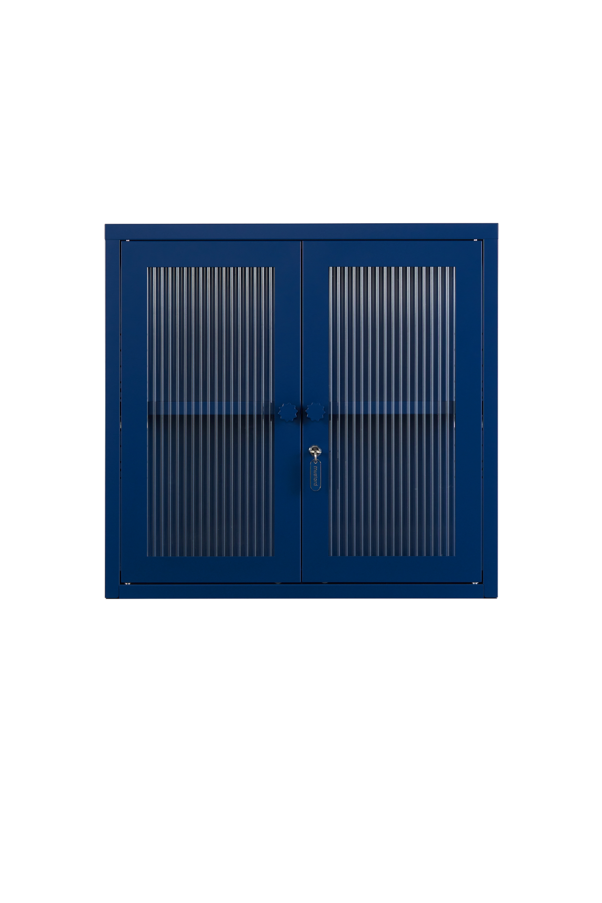 An adjustable shelf, lockable doors and fluted glass panels set in a metal frame.